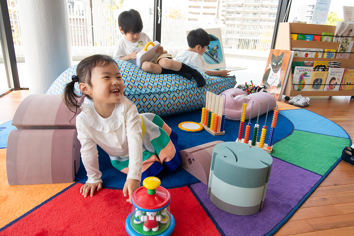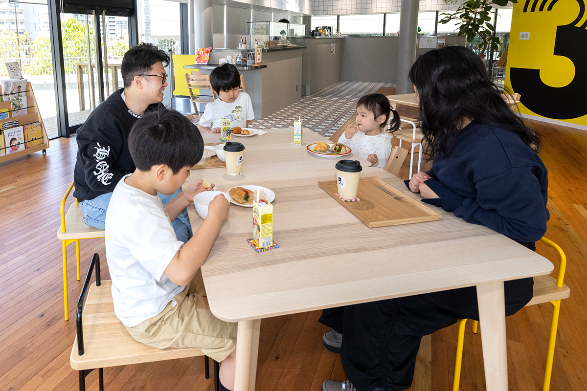 家族でランチやおやつを楽しんだ後は、プレイスペースで絵本を読んでリラックス。