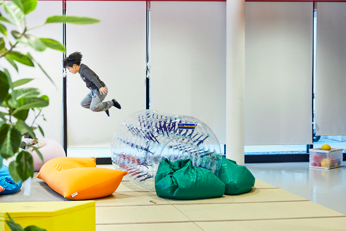 16:00~18:00の「選択タイム」では、子どもたちが活動内容を自由に選びます。PLAY CUBEで過ごすほか、近隣のボーネルンドあそびのせかい グランフロント大阪店に出かけることも可能。思い切りからだ遊びを楽しめます。